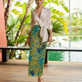 La gonna dritta, interamente ricamata con paillettes multicolor nei toni del verde citrus, del blu e dell’oro, crea un effetto visivo vibrante e glamour. Le fantasie floreali in rilievo esaltano la silhouette e aggiungono una nota artistica, ideale per chi ama distinguersi con eleganza.