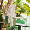 Un mix di luce, stile e femminilità: questo completo da cerimonia unisce l'eleganza senza tempo del bianco con l’energia frizzante del citrus, per un look raffinato e sorprendente. La blusa in raso bianco, con scollo a V incrociato e ampio fiocco in vita, regala un’allure sofisticata e contemporanea, perfetta per valorizzare il punto vita e slanciare la figura.