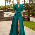 La cintura in vita, tono su tono, sottolinea la silhouette con grazia, mentre l’ampia gonna con spacco frontale aggiunge un tocco sensuale, perfettamente bilanciato dall’eleganza formale del modello. Il colore giada, ricercato e intenso, rende questo abito perfetto per eventi esclusivi, matrimoni civili, cerimonie pomeridiane o serate di gala.