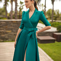 Eleganza sartoriale e femminilità contemporanea si fondono in questo abito da cerimonia color giada, pensato per la donna che desidera un look sofisticato ma fuori dagli schemi. Il design richiama il taglio di un blazer couture, con un elegante scollo a rever incrociato e maniche a tre quarti leggermente strutturate, che donano equilibrio e carattere.