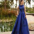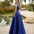 Imponente, romantico e assolutamente regale: questo abito da cerimonia blu è la quintessenza dell’eleganza. Caratterizzato da un raffinato scollo sciallato che incornicia con dolcezza il décolleté, il modello si apre in una voluminosa gonna a campana, perfetta per chi desidera un look da grande occasione.
