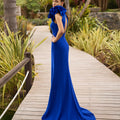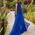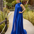 La silhouette aderente slancia la figura e si apre delicatamente sul fondo con una leggera coda, enfatizzando il portamento in ogni passo. Il punto forte è il mantello in chiffon leggero, ancorato alla spalla con un fiocco couture, che scivola lungo la schiena regalando un effetto etereo e di grande impatto visivo.