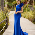 Iconico, sofisticato e dallo stile teatrale: questo abito da cerimonia blu conquista per il suo design scultoreo e l’effetto scenografico garantito. Il modello presenta un raffinato scollo all’americana che lascia le spalle scoperte, impreziosito da una maxi applicazione floreale tridimensionale sulla spalla, simbolo di eleganza contemporanea.