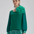 Un’esplosione di personalità e raffinatezza: questo completo da cerimonia donna in verde smeraldo è la scelta perfetta per chi desidera un look sofisticato e fuori dagli schemi. La casacca fluida con scollo rotondo presenta una linea essenziale ed elegante, impreziosita da una maxi applicazione floreale in organza sulla spalla, elemento scenografico che cattura lo sguardo e dona unicità al capo.