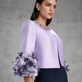 La giacca coordinata in mikado lilla, dalle linee strutturate e arricchita da maniche floreali tridimensionali, completa il look con un tocco couture, ideale per cerimonie importanti, eventi formali o ricevimenti di alto livello. La silhouette asciutta e la cura sartoriale dei dettagli rendono questo capo perfetto per chi cerca abiti da cerimonia a Roma che sappiano coniugare stile, comfort e personalità.