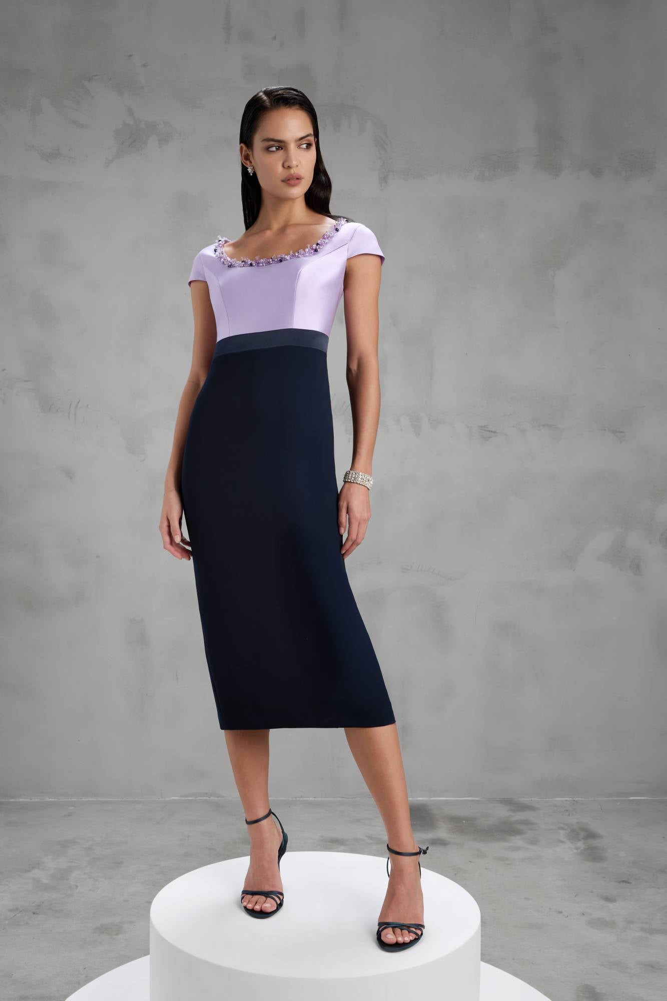 Raffinato ed esclusivo, questo abito da cerimonia donna nei toni del blu profondo e lilla rappresenta la perfetta unione tra eleganza classica e ricercatezza contemporanea. Il modello, composto da un tubino midi con corpetto lilla in mikado e gonna blu a contrasto, è impreziosito da uno scollo tondo ornato da applicazioni gioiello che donano luce al viso e valorizzano la femminilità con discrezione.