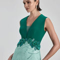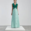 Il corpetto in tessuto liscio, con profondo scollo a V e inserti in tulle trasparente, incornicia con delicatezza il décolleté, mentre la vita è impreziosita da un ricamo tridimensionale di fiori e perle in tonalità smeraldo, applicati con minuziosa maestria. La gonna lunga, dal taglio leggermente svasato, è realizzata in tessuto jacquard verde acqua decorato con motivi scintillanti che catturano la luce con ogni movimento.