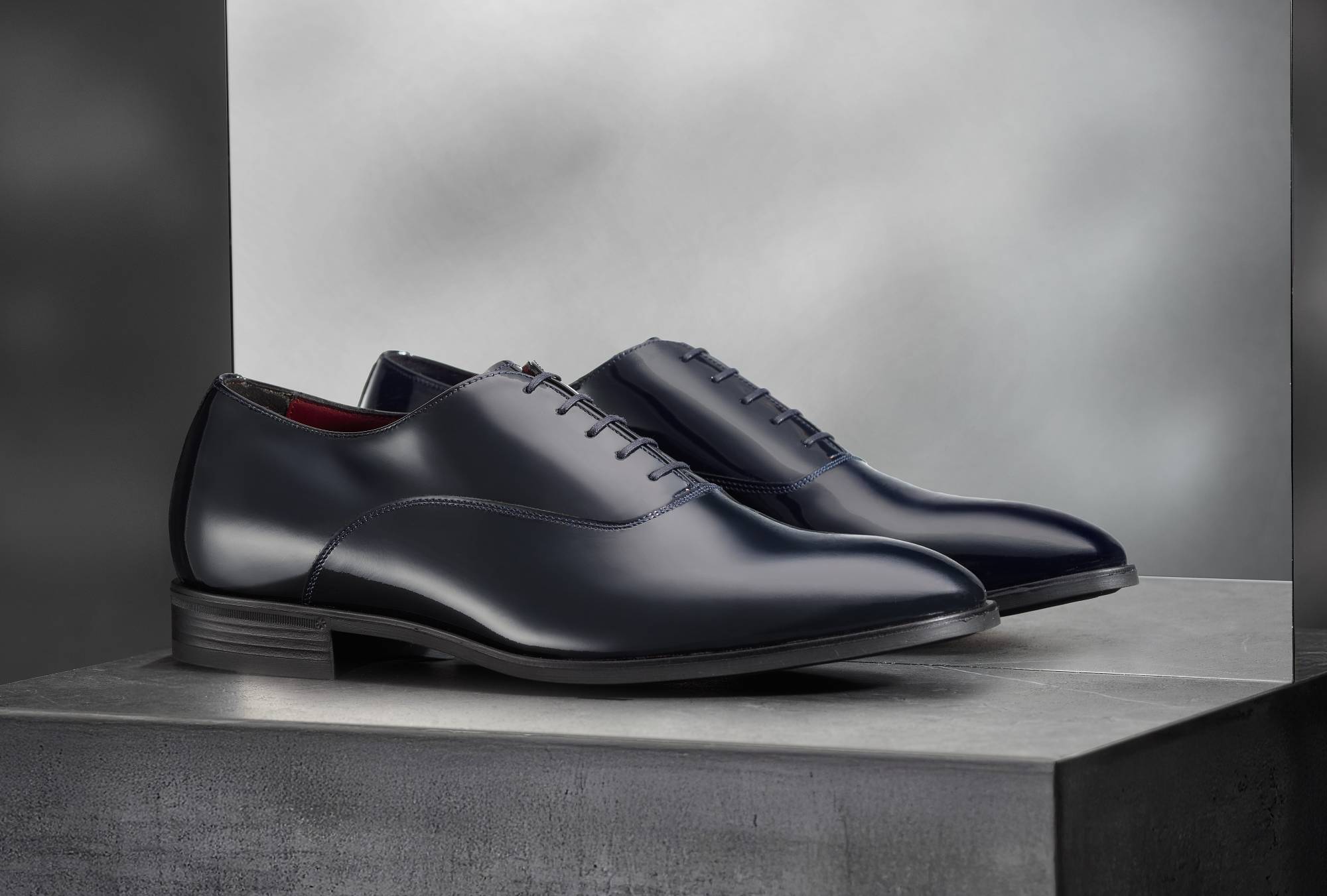La tomaia senza cuciture visibili valorizza la lucidatura a specchio, mentre la punta affusolata e il tacco basso donano un carattere contemporaneo all’abbigliamento elegante uomo.