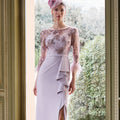 Il modello midi conquista al primo sguardo grazie allo scollo rotondo e al corpino in tulle ricamato con paillettes floreali, che dona luminosità e leggerezza all’intero outfit. Le maniche trasparenti a tre quarti, decorate da piume tono su tono, aggiungono un tocco couture dal fascino contemporaneo. La gonna avvolgente, con delicato drappeggio laterale e spacco frontale, esalta la silhouette con classe e movimento.