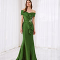 Il modello è impreziosito da un raffinato scollo omerale con linea a V, che valorizza il décolleté e le spalle con armonia, creando un effetto elegante e sensuale. La silhouette a sirena slancia la figura, mentre il corpino è arricchito da un drappeggio sartoriale che scende lungo il fianco, impreziosito da un’applicazione gioiello a forma di fiore. La gonna, morbida e fluida, accompagna i movimenti con portamento impeccabile.
