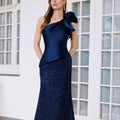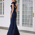 Perfetto per matrimoni serali, gala esclusivi e feste di lusso, questo abito in blu marino si abbina a décolleté dal design essenziale e clutch gioiello per completare un look scenografico e memorabile.