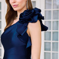 La silhouette segue una linea a sirena che slancia la figura, mentre la gonna in pizzo ricamato illumina l’abito con riflessi sofisticati. Il corpino strutturato, caratterizzato da un design scultoreo con maxi volant sul punto spalla, conferisce volume e teatralità, sottolineando l’unicità sartoriale di questo modello. La chiusura posteriore con bottoncini rivestiti aggiunge un dettaglio elegante e ricercato.