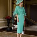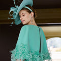 Il modello midi, raffinato e contemporaneo, valorizza la figura femminile con una silhouette strutturata e un taglio impeccabile. Il particolare scollo a goccia, incorniciato da un delicato inserto gioiello, aggiunge un tocco di luce e sensualità discreta. Le maniche ampie in stile mantella, arricchite da piume tono su tono, conferiscono movimento e charme al look, rendendolo ideale per cerimonie diurne, matrimoni eleganti, feste formali e ricevimenti di lusso.
