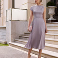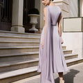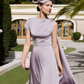 Perfetto per matrimoni, serate di gala, feste eleganti e ricevimenti di lusso, questo abito malva si abbina splendidamente a sandali gioiello e clutch dalle tonalità luminose per un look impeccabile.