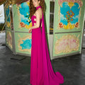 Un’esplosione di stile e personalità: questo abito fucsia da cerimonia è pensato per la donna che ama distinguersi con audacia e raffinatezza. Il design moderno è caratterizzato da un elegante scollo dritto senza spalline, valorizzato da un collo alto con drappo lungo che cade con movimento fluido lungo la schiena, creando un gioco di contrasti tra linee minimal e dettagli scenografici.