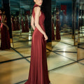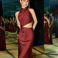 Il raffinato dettaglio cut-out laterale scolpisce la silhouette con sensualità, mentre il drappeggio centrale dona movimento e fluidità. Il colore bordeaux, profondo e seducente, è ideale per cerimonie eleganti, serate di gala, feste formali o un 18esimo di grande impatto.