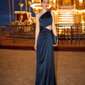 Un’eleganza moderna che non passa inosservata: questo abito da cerimonia è la sintesi perfetta tra sensualità e raffinatezza. Il design monospalla, reso ancora più scenografico dal taglio cut-out in vita, crea un effetto scultoreo che valorizza la silhouette in modo deciso e armonioso.