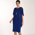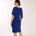 Il modello presenta uno scollo tondo e una leggera cappa in chiffon a strati che scivola sulle spalle creando un raffinato gioco di trasparenze e movimento. Il corpo dell’abito, in crêpe elasticizzato, segue le linee con delicatezza senza segnare; lo spacco posteriore garantisce libertà di passo e una vestibilità confortevole per tutta la durata dell’evento. Le finiture pulite e l’asimmetria della cappa slanciano la figura, regalando un’armonia impeccabile a ogni silhouette.