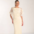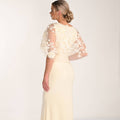 Il corpino è impreziosito da una sovrapposizione eterea in tulle con applicazioni floreali 3D e maniche a mantella leggere che velano le spalle con charme. La gonna in crêpe fluido presenta una leggera drappeggiatura sul punto vita per un effetto snellente, proseguendo in una silhouette morbida e scivolata che garantisce vestibilità confortevole e movimento naturale ad ogni passo. Finiture curate e materiali di qualità confermano lo spirito sartoriale del capo.