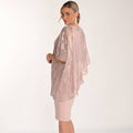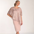 Luminoso e ultra–raffinato, questo abito in colore blush è la scelta ideale per chi cerca abiti capaci di unire classe ed estrema portabilità. Il design a tubino con cappa valorizza la silhouette con linee pulite: il corpo in crêpe elasticizzato modella senza costringere, mentre la cappa asimmetrica in chiffon lamé, leggera e scintillante, dona movimento e un’elegante copertura delle spalle. Lo scollo tondo incornicia il décolleté con discrezione; fodera morbida e cuciture sartoriali assicurano una vestibilità confortevole dall’aperitivo al brindisi finale.