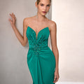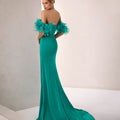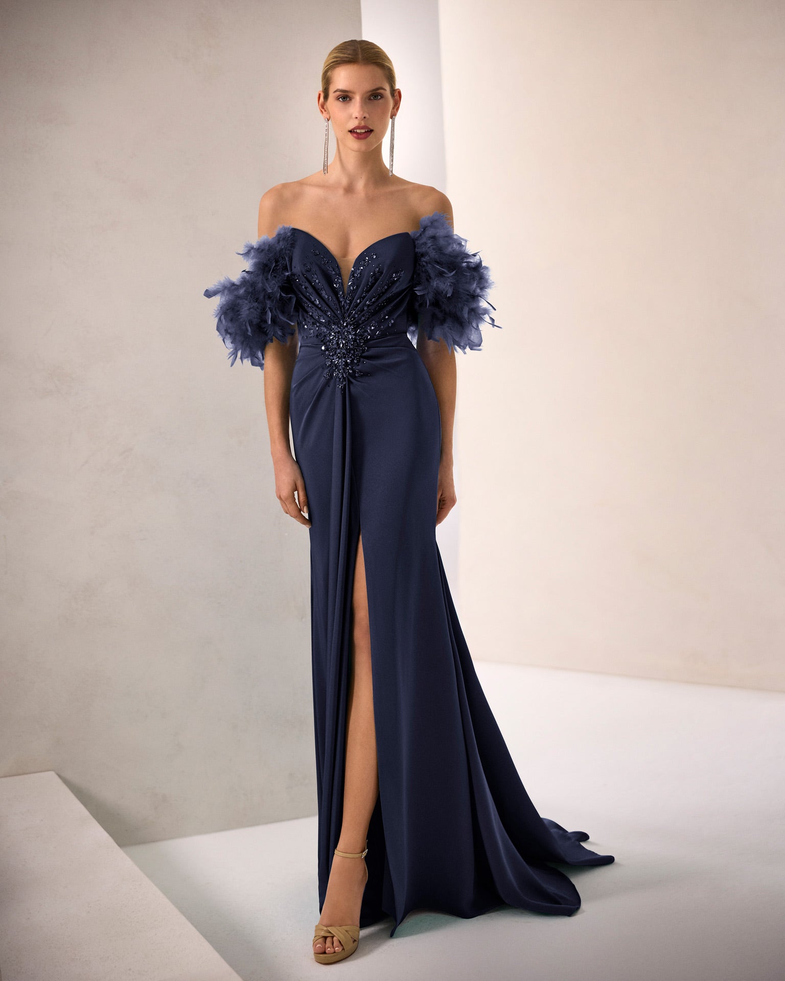 Lo scollo a cuore scolpisce con delicatezza il décolleté, mentre la silhouette a sirena con spacco frontale slancia la figura in modo impeccabile. Il punto vita è impreziosito da un raffinato gioco di drappeggi e applicazioni gioiello che catturano la luce con ogni movimento. Il tocco di grande impatto scenico? Le maniche off-shoulder in piume tono su tono, per un effetto glamour e sofisticato, perfetto per serate di gala, matrimoni eleganti o feste esclusive.