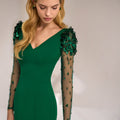 Il verde profondo rende l’abito estremamente versatile e adatto a tutte le stagioni, perfetto da abbinare a sandali dorati e gioielli verde smeraldo per un look coordinato e ricercato.