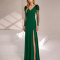 Lo scollo a V valorizza con delicatezza il décolleté, mentre la linea a sirena slancia la figura con armonia. Le maniche lunghe in tulle trasparente sono impreziosite da un raffinato ricamo in paillettes e microperle tono su tono, che si estende sulle spalle con un motivo tridimensionale dal forte impatto visivo. Lo spacco frontale aggiunge un tocco di sensualità bilanciata, mantenendo l’equilibrio tra eleganza e femminilità.