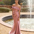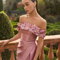 Lo scollo omerale è impreziosito da un’applicazione floreale tridimensionale che aggiunge un tocco di poesia e unicità, incorniciando con raffinatezza spalle e décolleté. Il corpetto avvolgente scolpisce la silhouette, mentre la gonna lunga con drappeggio laterale e inserto plissé crea un movimento armonioso e fluido.
