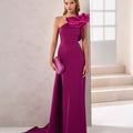 La linea sinuosa è valorizzata dal raffinato scollo mono spalla, impreziosito da un maxi volant in satin che dona volume e carattere, trasformando il capo in un’opera d’arte sartoriale. La gonna, fluida e avvolgente, presenta uno spacco elegante e una coda che scivola leggera sul pavimento, creando un effetto di grande impatto visivo ad ogni passo.