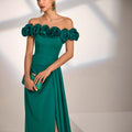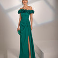 La silhouette slanciata ed elegante è arricchita da un raffinato scollo omerale, impreziosito da applicazioni floreali tridimensionali che creano un dettaglio scultoreo e di grande impatto visivo. La linea scivolata valorizza la figura con armonia, mentre lo spacco laterale dona movimento e un tocco di sensualità discreta.