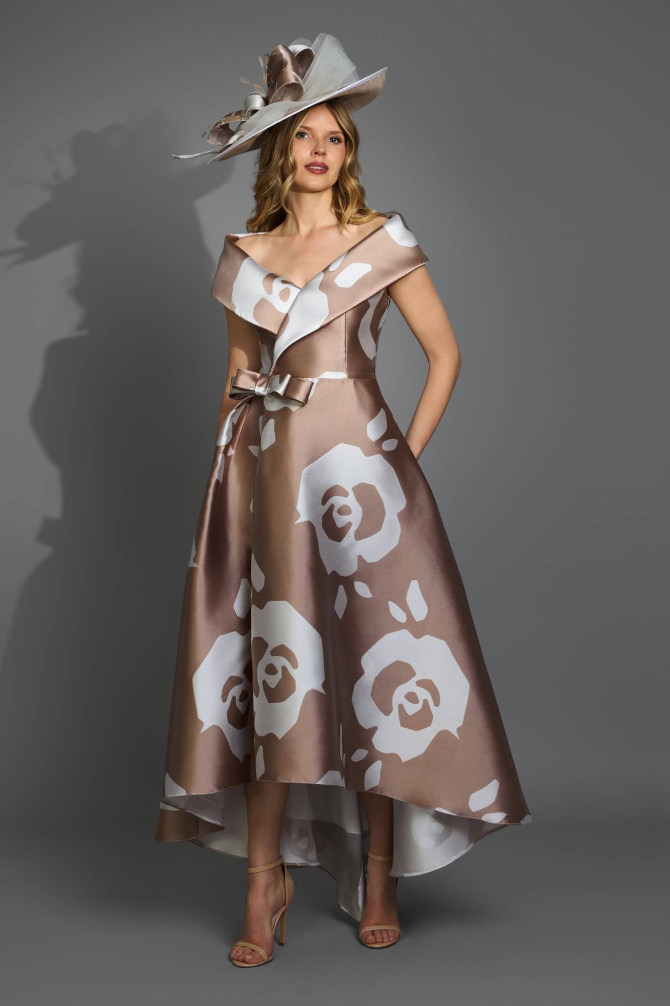 Questo abito incarna un’eleganza scenografica e senza tempo, pensata per chi desidera distinguersi con stile nei migliori eventi. Realizzato in tessuto lucente effetto satin, presenta un raffinato motivo floreale macro a contrasto che impreziosisce la linea. La costruzione sartoriale valorizza il punto vita con un fiocco applicato e una gonna a ruota con orlo asimmetrico high-low, perfetta per slanciare la figura e mettere in risalto sandali e décolleté. Il collo a spalle scoperte tipo Bardot dona femminilità e rende questo capo di abbigliamento elegante donna ideale per matrimoni, serate di gala, eventi formali e feste di lusso.