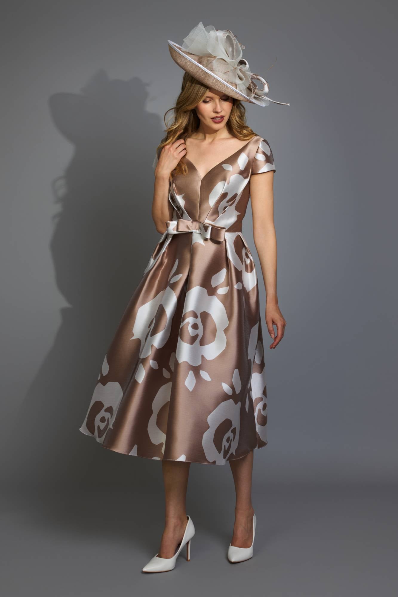 Questo abito incarna un’eleganza contemporanea e impeccabile, pensata per chi desidera distinguersi. Realizzato in mikado luminoso con macro stampa floreale a contrasto, valorizza la silhouette con corpino strutturato, scollo a V e maniche corte. Il punto vita è sottolineato da un delicato fiocco, mentre la gonna midi a ruota cade con volume armonioso, garantendo una vestibilità confortevole ma scenografica: un esempio perfetto di abbigliamento elegante per occasioni speciali.