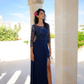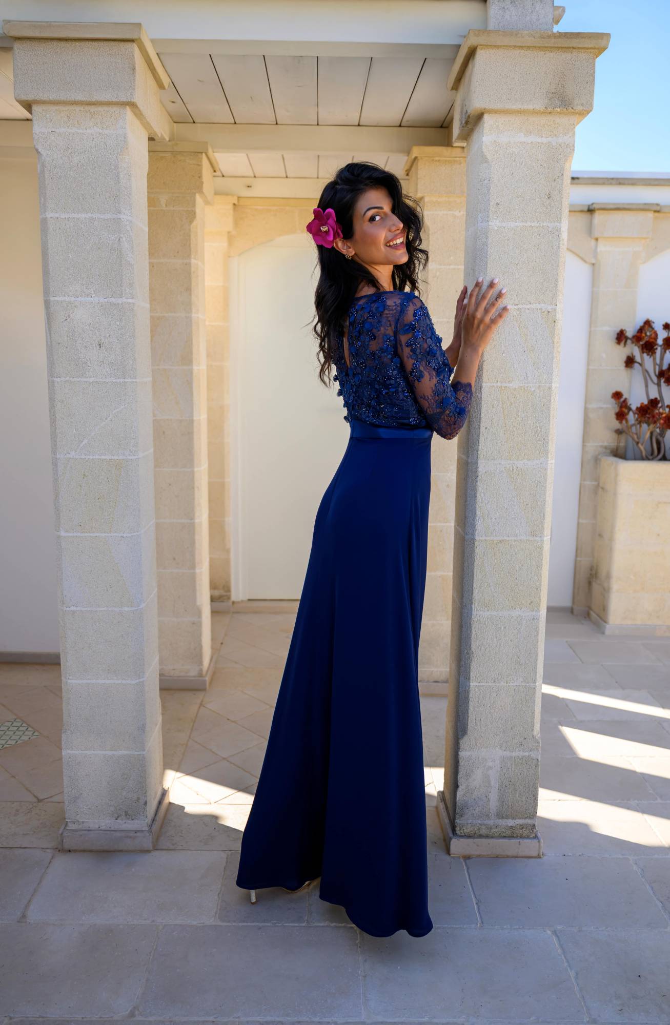 Un’eleganza che lascia il segno: questo abito da cerimonia in blu unisce artigianalità e charme contemporaneo.
