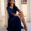 Il corpetto, impreziosito da pizzo ricamato 3D, disegna un raffinato gioco di rilievi e trasparenze sulle maniche al gomito, mentre lo scollo rotondo incornicia con armonia il décolleté. Sul retro, una delicata goccia aggiunge un tocco di femminilità. La linea scivolata parte da un punto vita definito e si apre in una gonna in doppio georgette dalla fluidità impeccabile; lo spacco laterale (discreto e funzionale) allunga la silhouette e accompagna con grazia ogni passo.