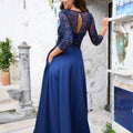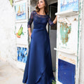 Un’eleganza scenografica pensata per chi desidera distinguersi: questo abito lungo da cerimonia in blu unisce la struttura preziosa del mikado rock alla raffinatezza del pizzo ricamato, creando un look esclusivo e impeccabile.