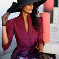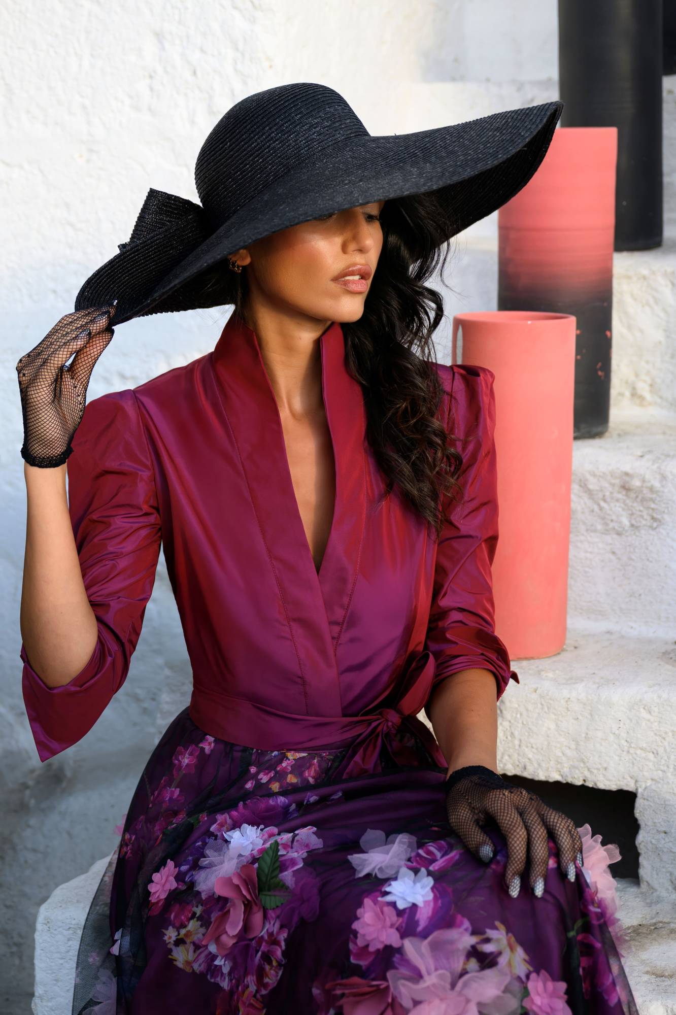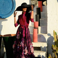 Un completo esclusivo che unisce classe e personalità: camicia con colletto e gonna in raffinato borgogna, pensato per chi desidera distinguersi con un’eleganza contemporanea. La camicia, realizzata in taffetà luminoso, presenta un colletto strutturato con apertura centrale che allunga la linea del collo e spalle leggermente costruite; la cintura a nastro evidenzia il punto vita con una definizione sartoriale impeccabile. La gonna lunga, in tulle leggero con ricami floreali e applicazioni 3D, crea un volume etereo che accompagna i movimenti con grazia.