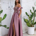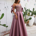Un abito lungo dal fascino scenografico, pensato per lasciare il segno: il nostro modello in colore Barolo unisce eleganza e carattere con uno scollo a cuore ricamato a mano e spalline scese impreziosite da maxi fiocchi. Il corpino, in tulle decorato con micro-perle e paillettes, è sostenuto da stecche leggere e coppe interne per una vestibilità sicura; la gonna in mikado a vita alta scivola ampia con pieghe couture, rivelando uno spacco frontale che slancia con misura.