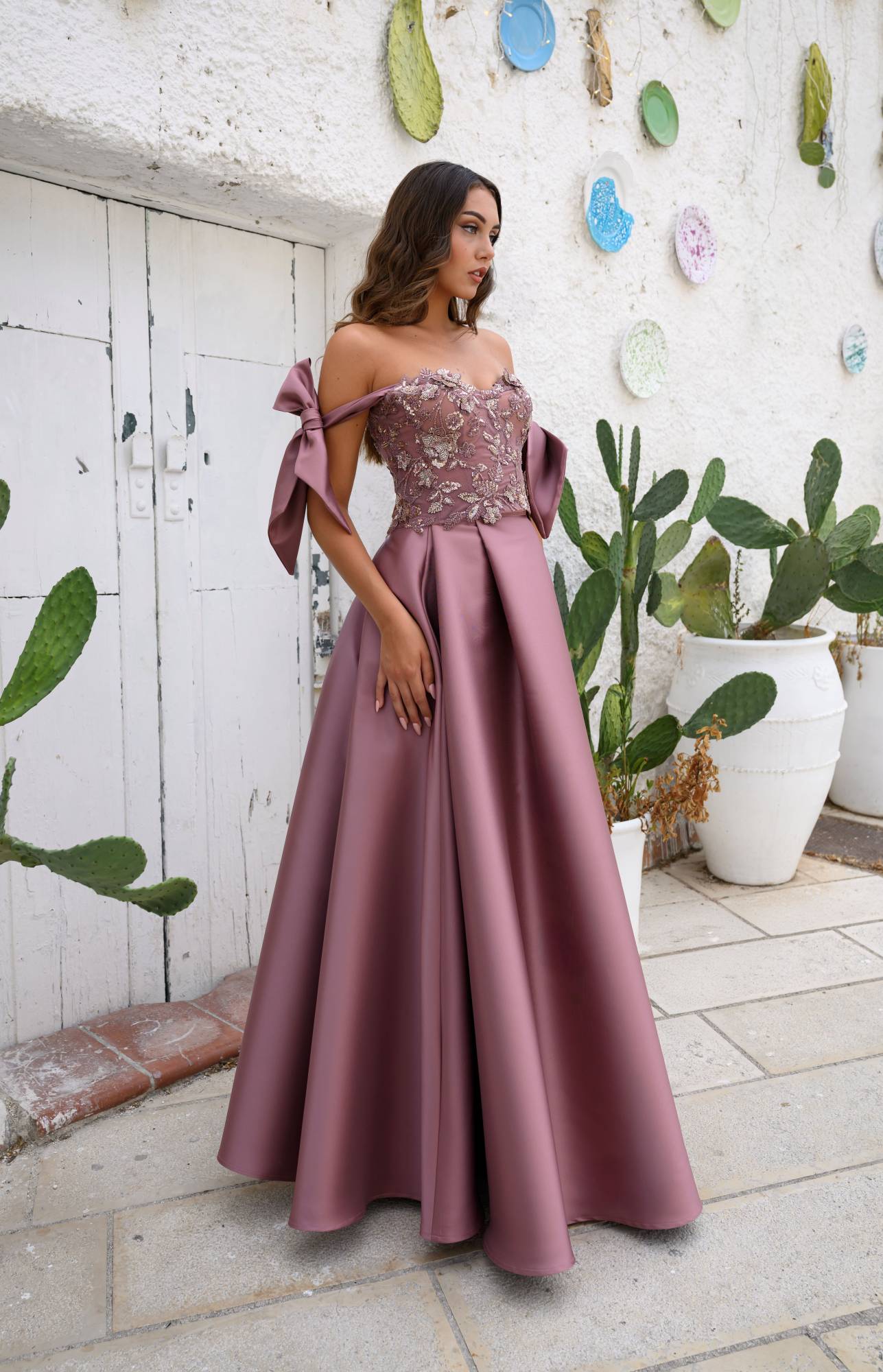 Un abito lungo dal fascino scenografico, pensato per lasciare il segno: il nostro modello in colore Barolo unisce eleganza e carattere con uno scollo a cuore ricamato a mano e spalline scese impreziosite da maxi fiocchi. Il corpino, in tulle decorato con micro-perle e paillettes, è sostenuto da stecche leggere e coppe interne per una vestibilità sicura; la gonna in mikado a vita alta scivola ampia con pieghe couture, rivelando uno spacco frontale che slancia con misura.