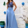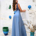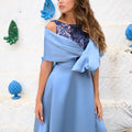 Il corpino, con scollo rotondo frontale e seducente schiena a V, è ricamato con micro-paillettes e perline in sfumature del blu che disegnano motivi foliage, regalando luce al volto. La fascia alta in vita valorizza la silhouette e introduce la gonna ampia in tessuto strutturato dal finish setoso, studiata per cadere impeccabile ad ogni passo. Dettaglio prezioso: tasche laterali invisibili per un’eleganza pratica e contemporanea. La stola coordinata in carta da zucchero completa il look con un drappeggio morbido, perfetto per la cerimonia e per gli scatti più raffinati.