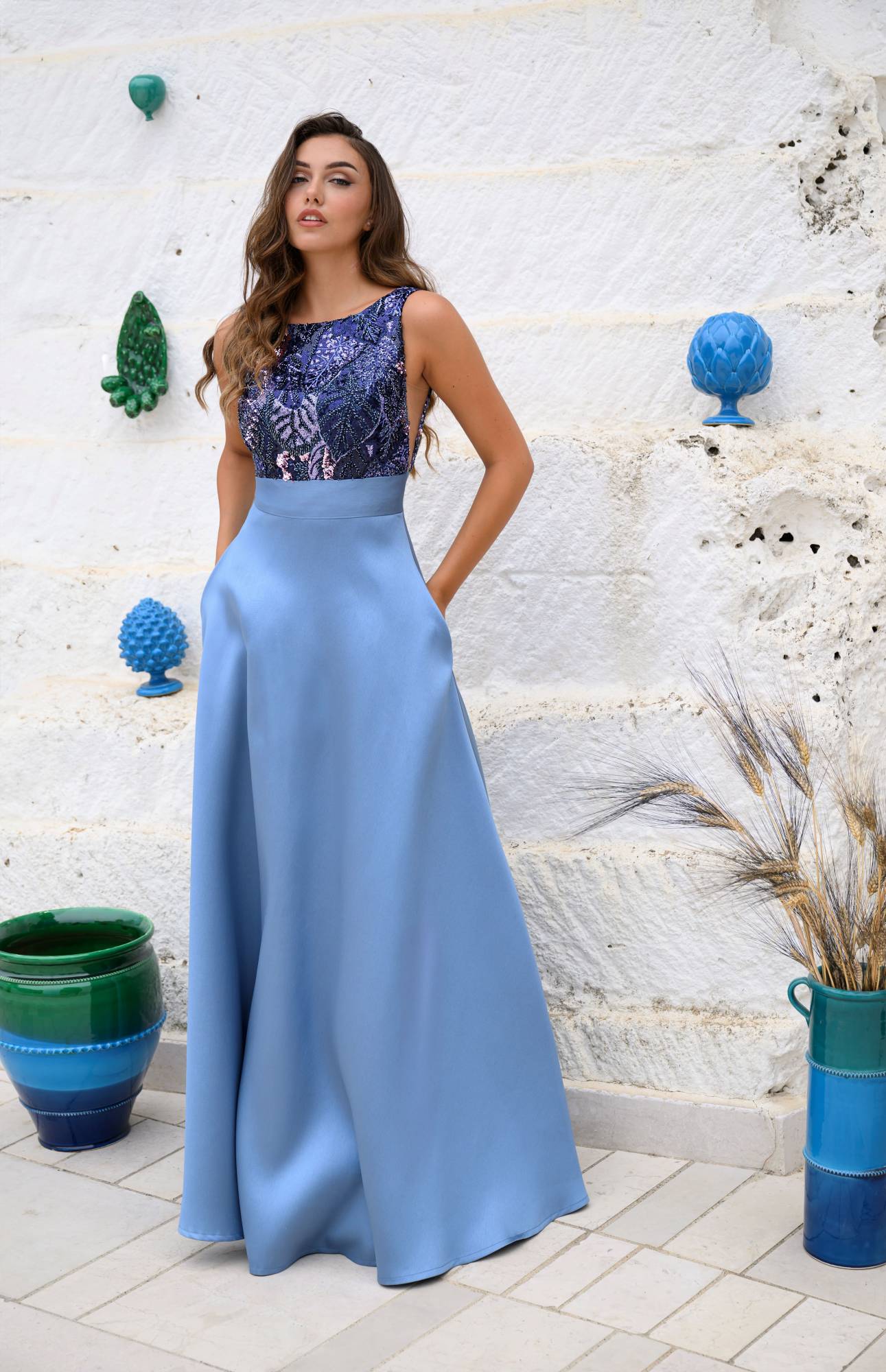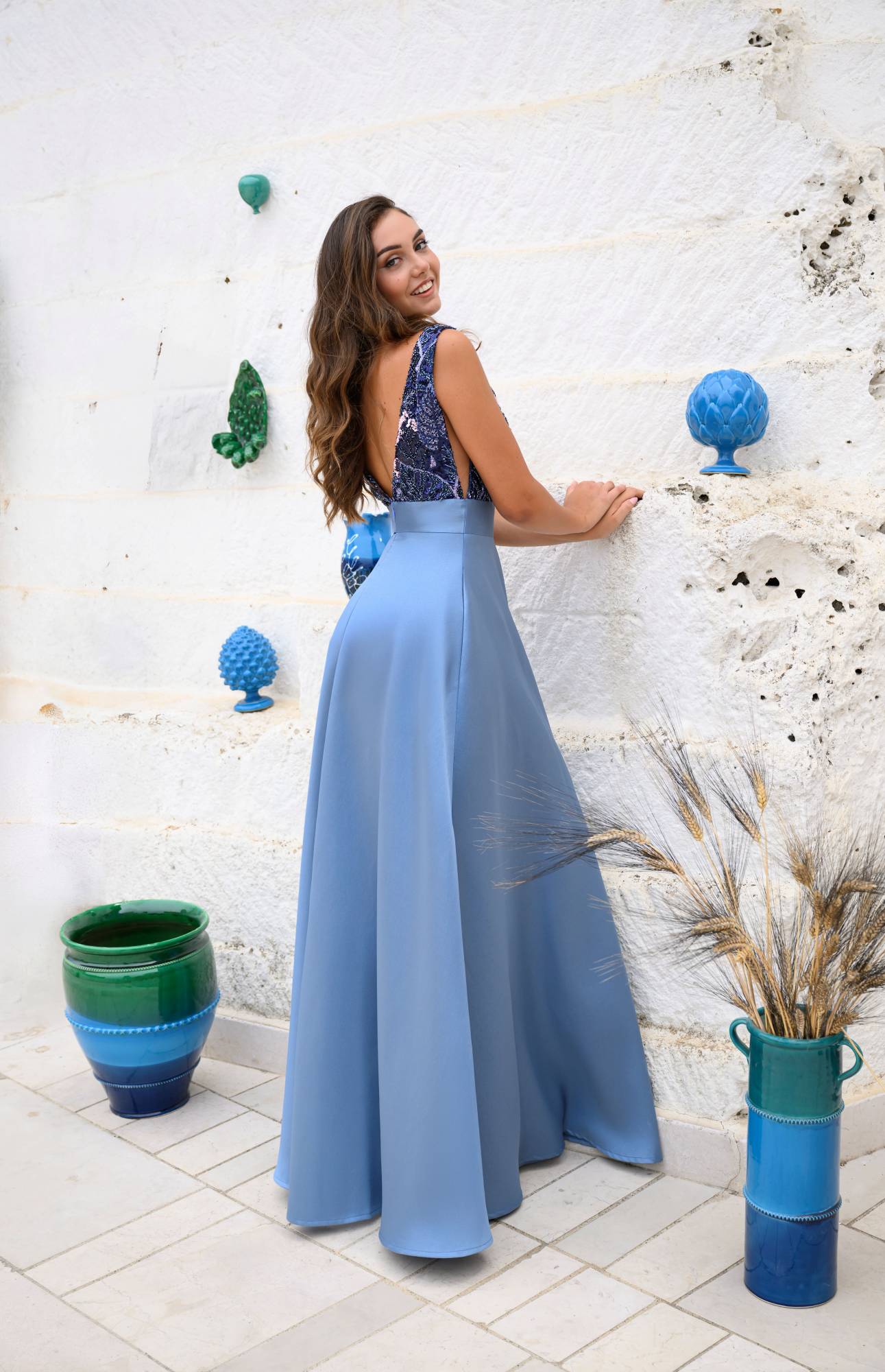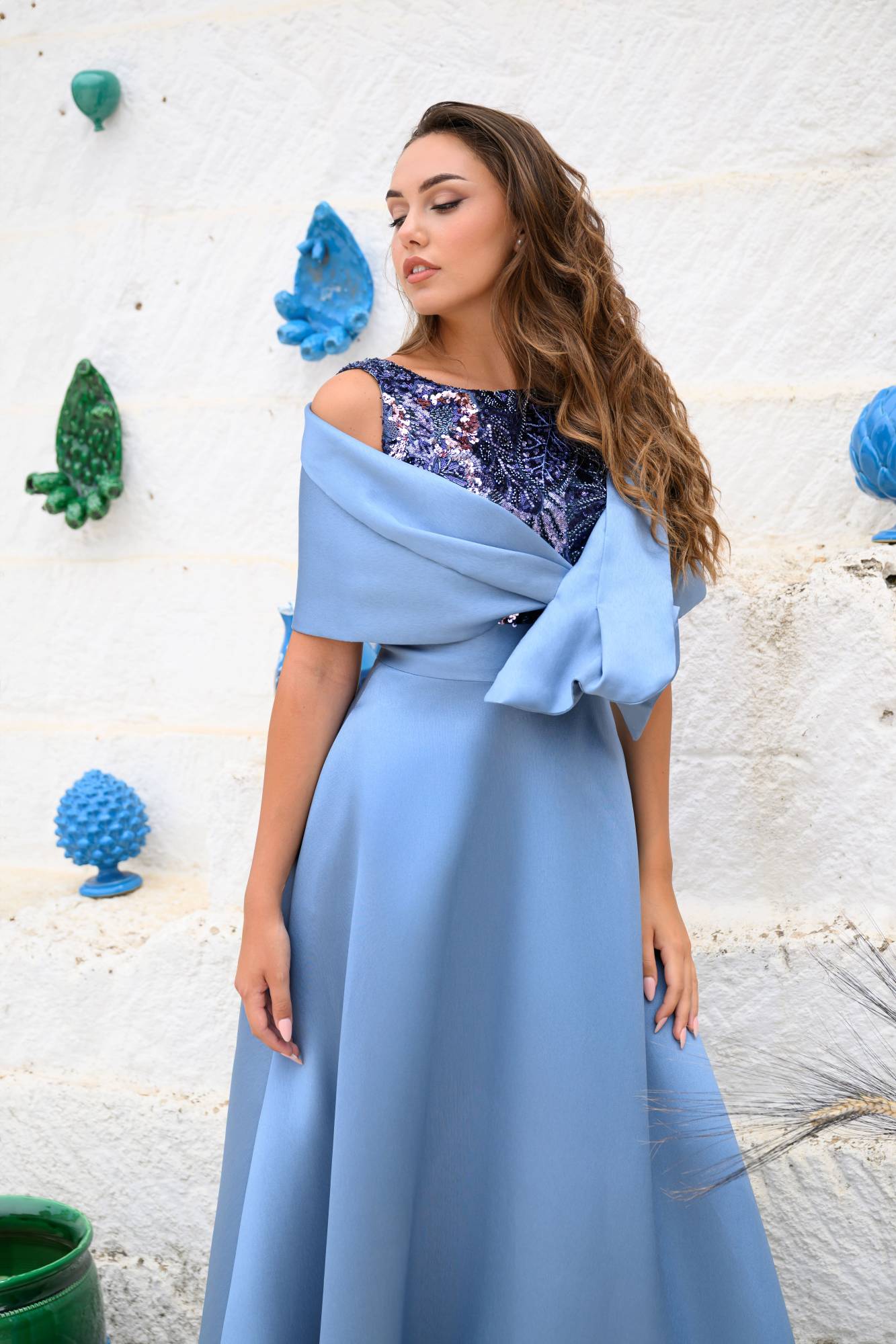 Il corpino, con scollo rotondo frontale e seducente schiena a V, è ricamato con micro-paillettes e perline in sfumature del blu che disegnano motivi foliage, regalando luce al volto. La fascia alta in vita valorizza la silhouette e introduce la gonna ampia in tessuto strutturato dal finish setoso, studiata per cadere impeccabile ad ogni passo. Dettaglio prezioso: tasche laterali invisibili per un’eleganza pratica e contemporanea. La stola coordinata in carta da zucchero completa il look con un drappeggio morbido, perfetto per la cerimonia e per gli scatti più raffinati.