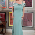 Un’eleganza pensata per valorizzare le forme: la linea scivolata con leggera svasatura al fondo scolpisce con discrezione, mentre lo scollo omerale drappeggiato, annodato su un lato, incornicia spalle e décolleté con raffinata femminilità. Le spalline gioiello aggiungono un tocco luminoso, perfetto per chi cerca abbigliamento elegante donna capace di unire stile e comfort.