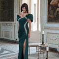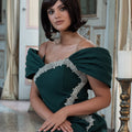 Un capo che unisce eleganza e sensualità. Lo scollo omerale, caratterizzato da morbide drappeggiature, lascia scoperte le spalle in modo sofisticato, mentre il dettaglio gioiello applicato sul corpetto crea un gioco di luce prezioso e ricercato.