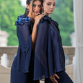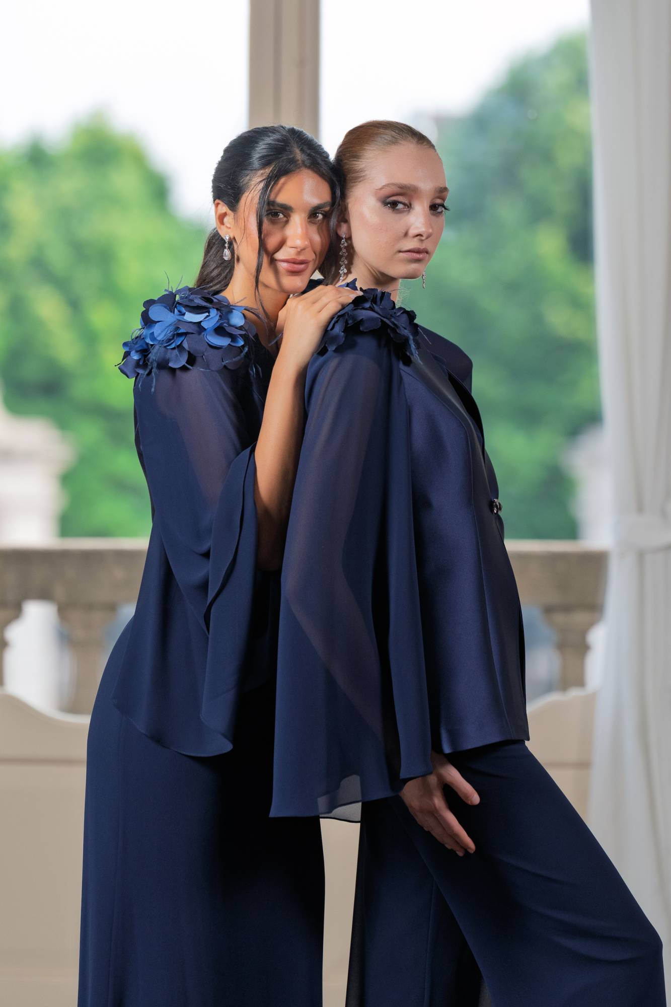Giacca in chiffon blu, dalla linea morbida e fluida, con maniche ampie che scivolano leggere. Le spalle sono arricchite da applicazioni floreali tridimensionali in tessuto, che donano carattere e raffinatezza al capo. Una chiusura discreta con gancio centrale completa il design con classe.