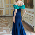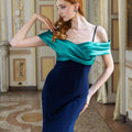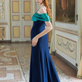 Seduzione raffinata e linee fluide definiscono questo abito scivolato da cerimonia donna, perfetto per chi cerca un look elegante ma contemporaneo per eventi di prestigio. Il contrasto tra il blu notte della base e il delicato drappeggio salvia che avvolge le spalle crea un equilibrio armonioso tra modernità e classicismo, esaltando al massimo la femminilità.