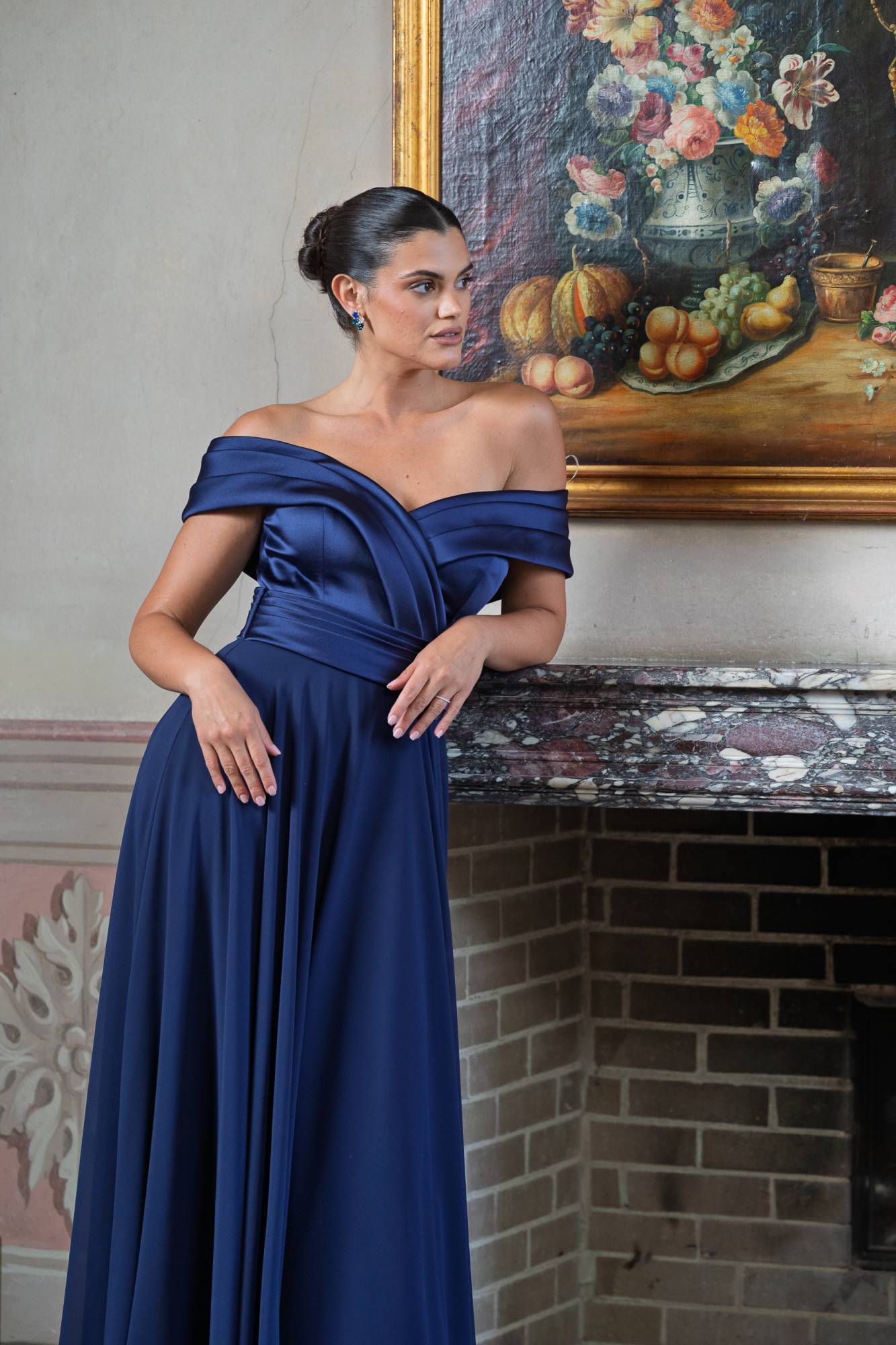 Un'eleganza che conquista al primo sguardo: questo abito lungo da cerimonia donna, realizzato in un intenso colore indaco, è la scelta ideale per chi desidera distinguersi con grazia e raffinatezza. Lo scollo omerale, con drappeggio incrociato sul décolleté, sottolinea la femminilità con equilibrio e charme, lasciando le spalle delicatamente scoperte.