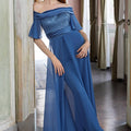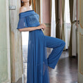 Il corpino presenta uno scenografico scollo omerale con drappeggio che valorizza spalle e décolleté; il bustier, illuminato da microperline e paillettes ton sur ton, scolpisce la silhouette con una vestibilità confortevole. La vita è definita da una cintura in satin, mentre il pantalone palazzo in chiffon leggero cade fluido e slancia la figura. Completa l’insieme una sovragonna aperta che crea movimento ad ogni passo, per un effetto etereo e couture.