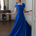 Un’eleganza scenografica che conquista al primo sguardo. Realizzato in mikado luminoso, alterna struttura e fluidità: il corpetto essenziale scolpisce la linea con tagli principessa, mentre la gonna a ruota si apre in un movimento morbido che sfiora il pavimento. Lo scollo asimmetrico è il dettaglio couture che rende unico il modello: una fascia drappeggiata che abbraccia le spalle e culmina in un maxi fiocco laterale, elegante e fotografico.