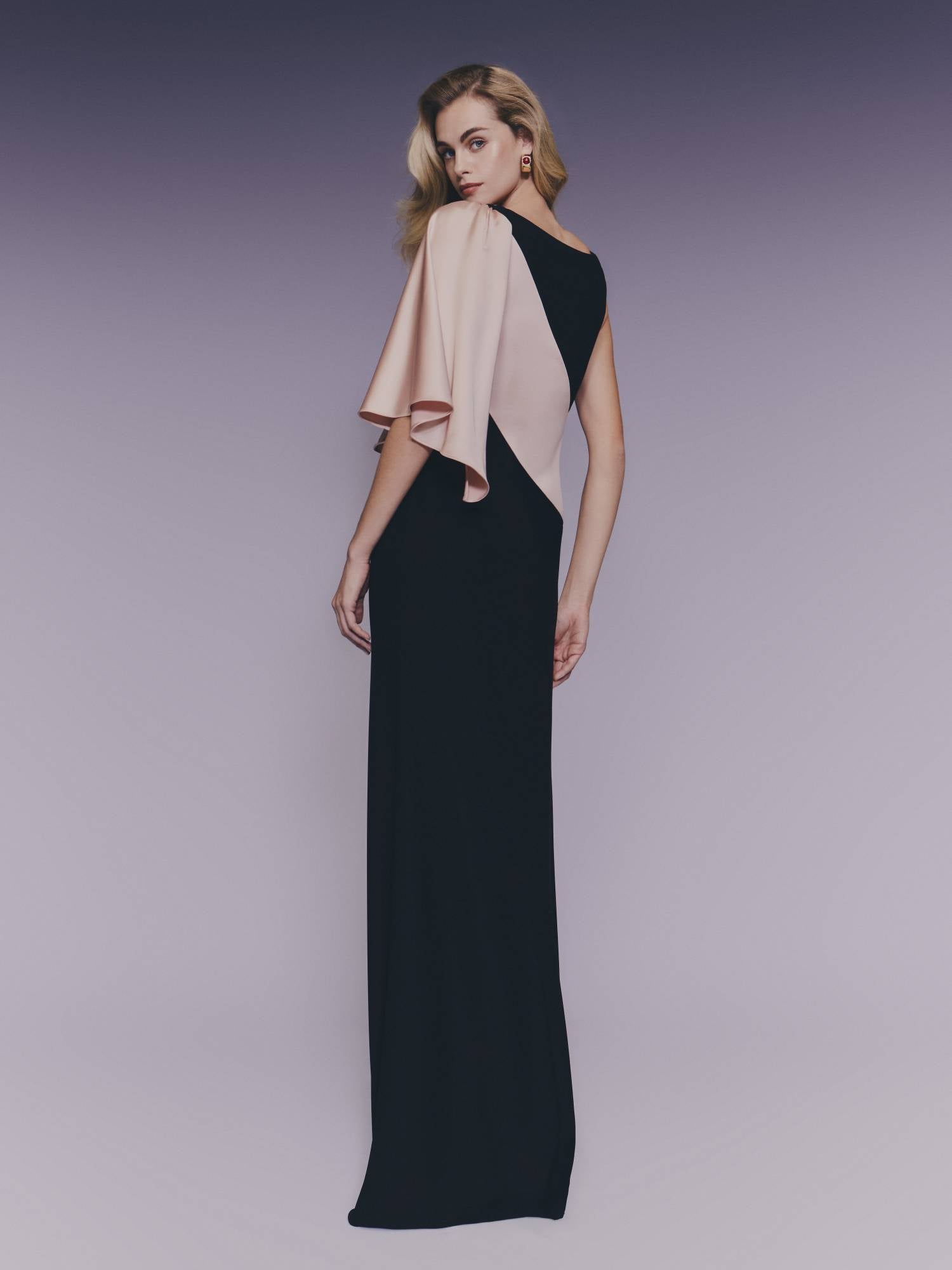 Un’eleganza scenografica che non passa inosservata: questo abito lungo a sirena in nero e rosa è pensato per chi cerca un abito con una cifra stilistica decisa e raffinata. La silhouette avvolgente scolpisce le forme con linee pure, mentre l’inserto diagonale in raso rosa illumina il davanti e continua sulla spalla creando una cappa morbida dal movimento fluido. Lo scollo tondo mantiene l’insieme essenziale e contemporaneo, bilanciando l’asimmetria con estrema armonia.