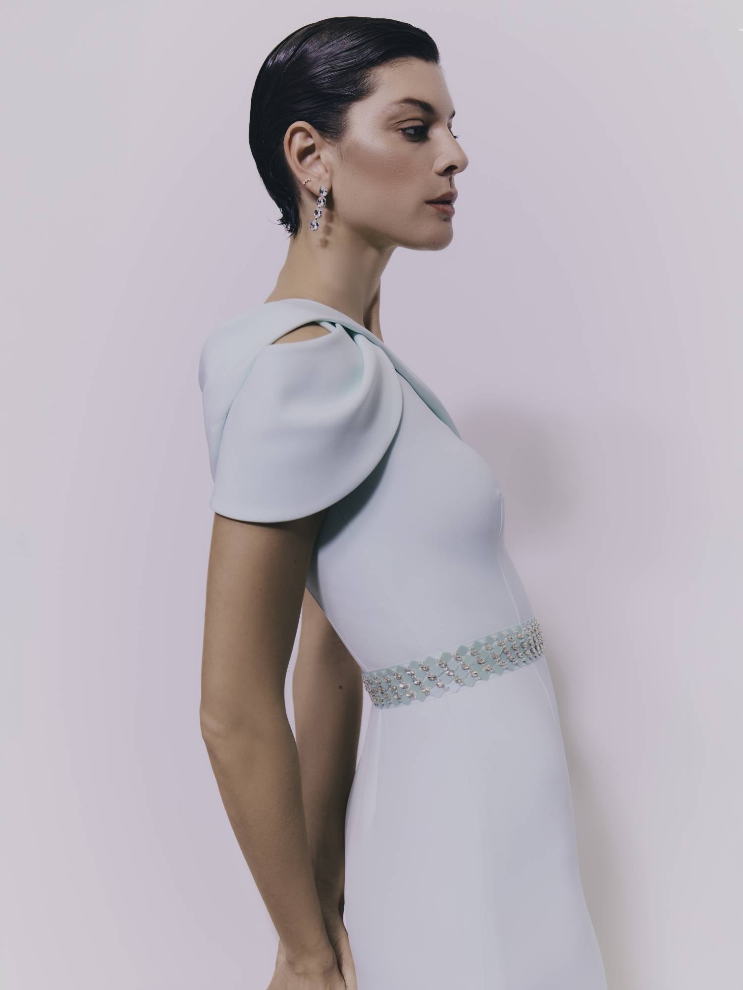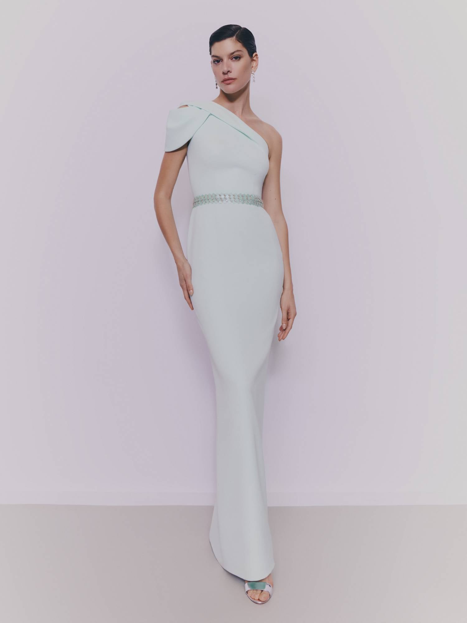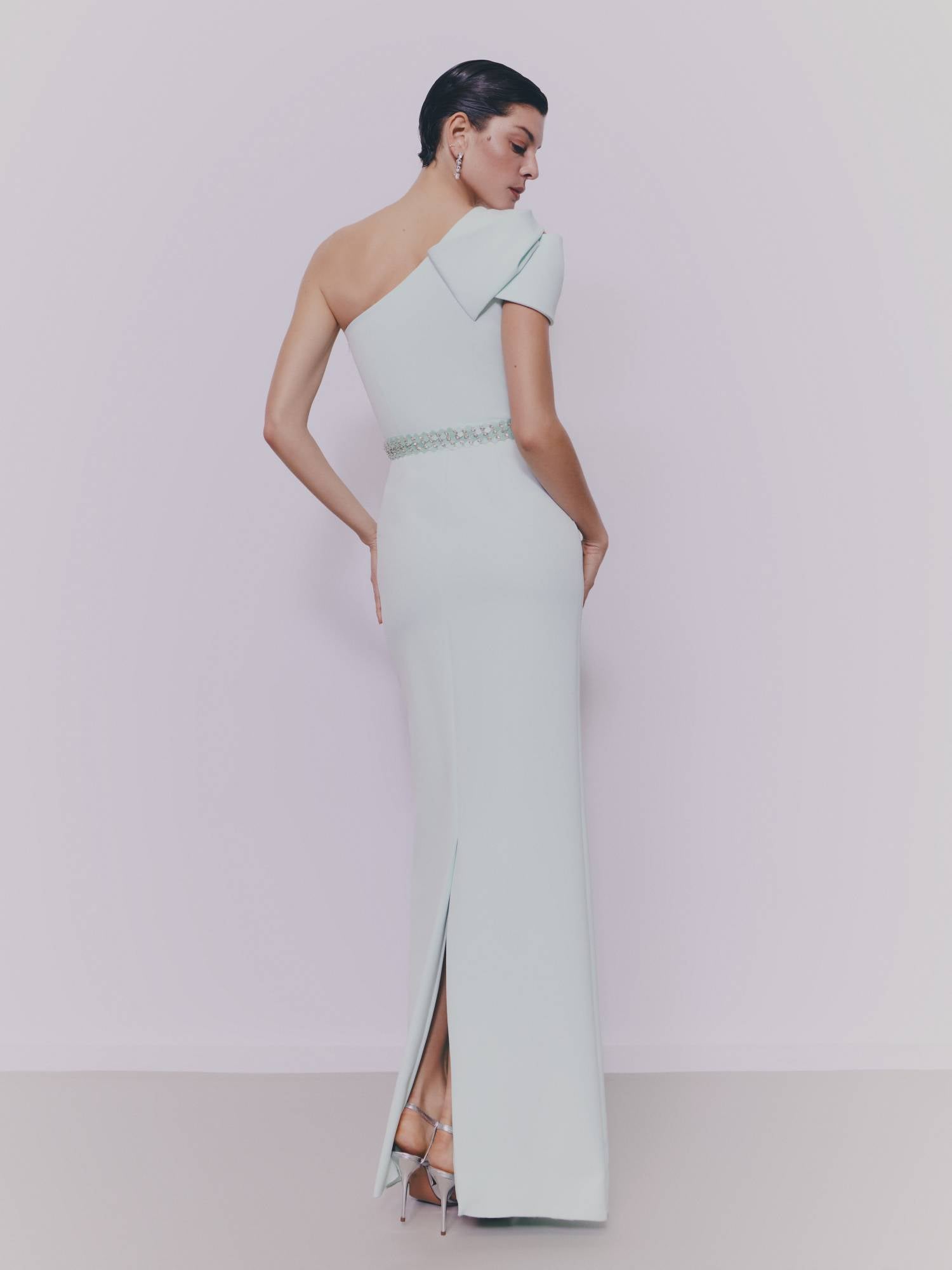 La spallina strutturata e il taglio asimmetrico donano un tocco di modernità, mentre la cintura gioiello in vita aggiunge una luce preziosa che valorizza la figura. La tonalità pastello, delicata e sofisticata, rende questo modello perfetto per cerimonie, serate di gala o eventi speciali in cui distinguersi con classe.