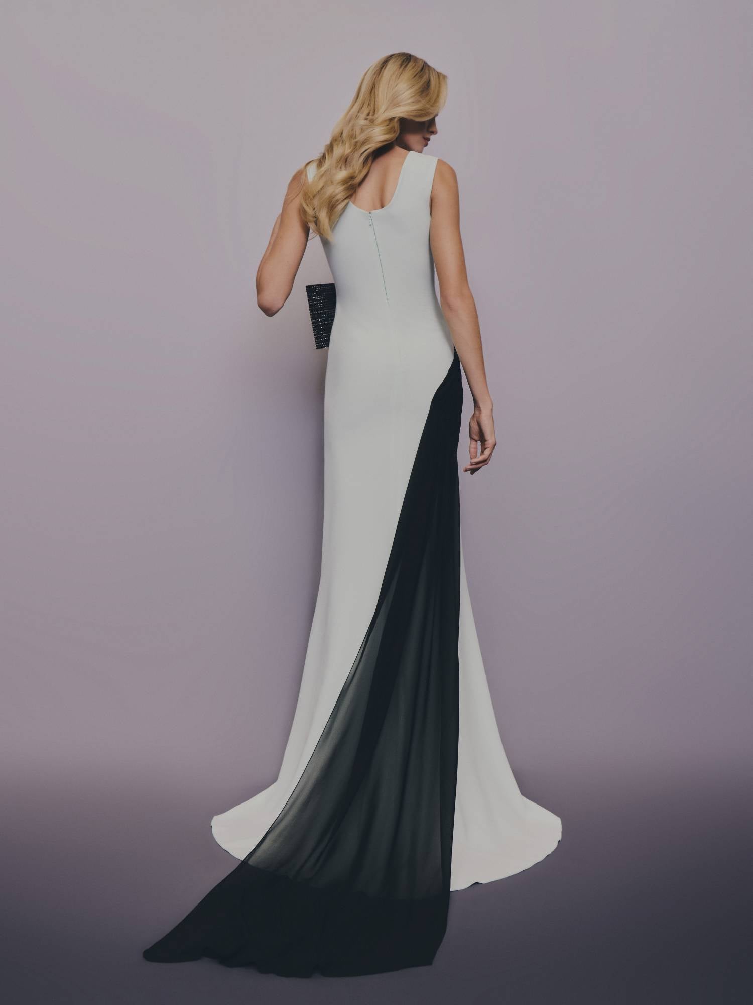 Realizzato in tessuto liscio e compatto, presenta una base color avorio impreziosita da un drappeggio asimmetrico nero che si avvolge delicatamente sul busto e prosegue in una coda leggera in chiffon, creando un movimento armonioso ad ogni passo.